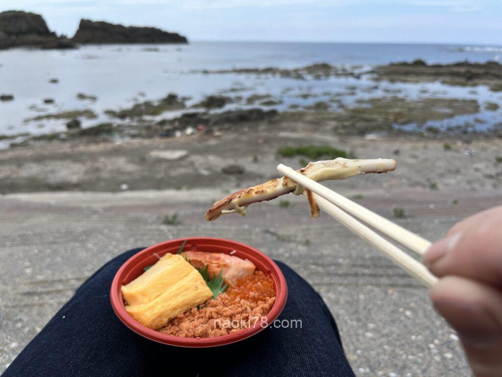 売店で売っていたいくら丼とイカ焼きで昼飯終了。