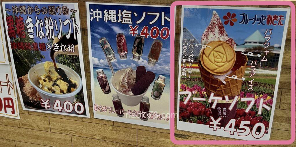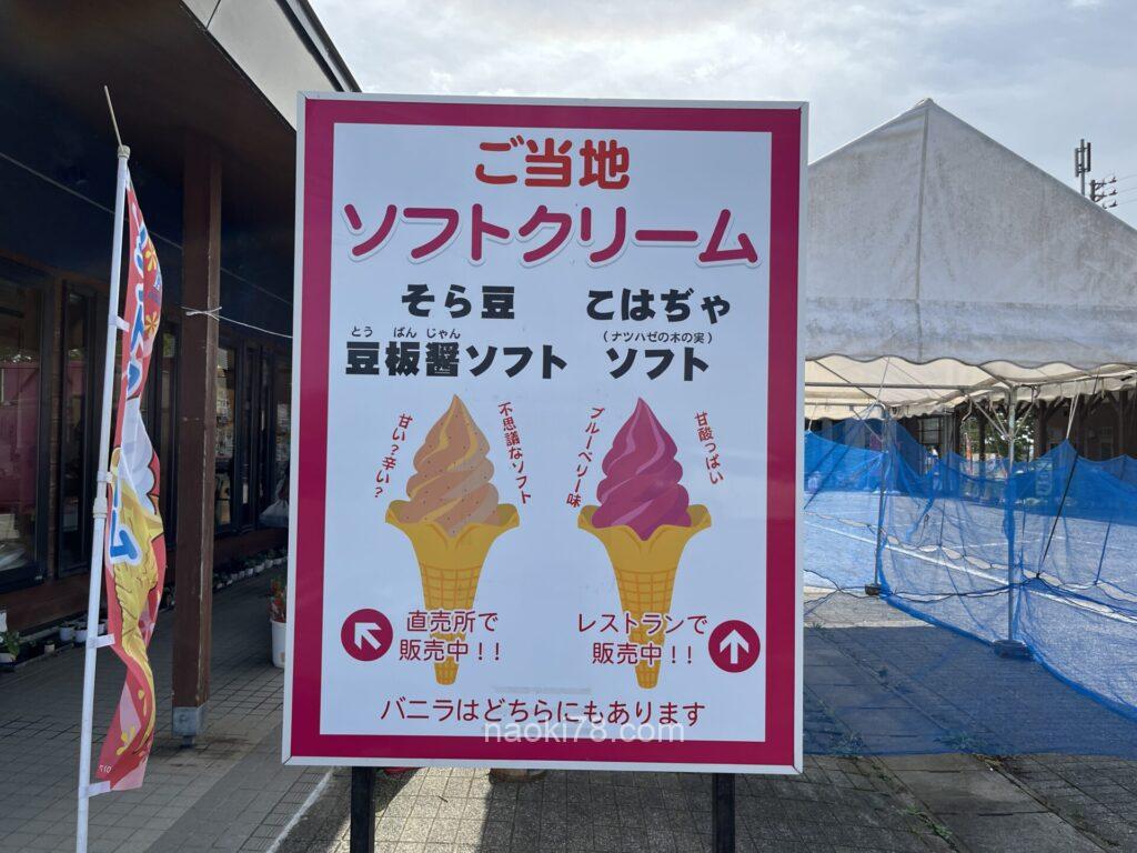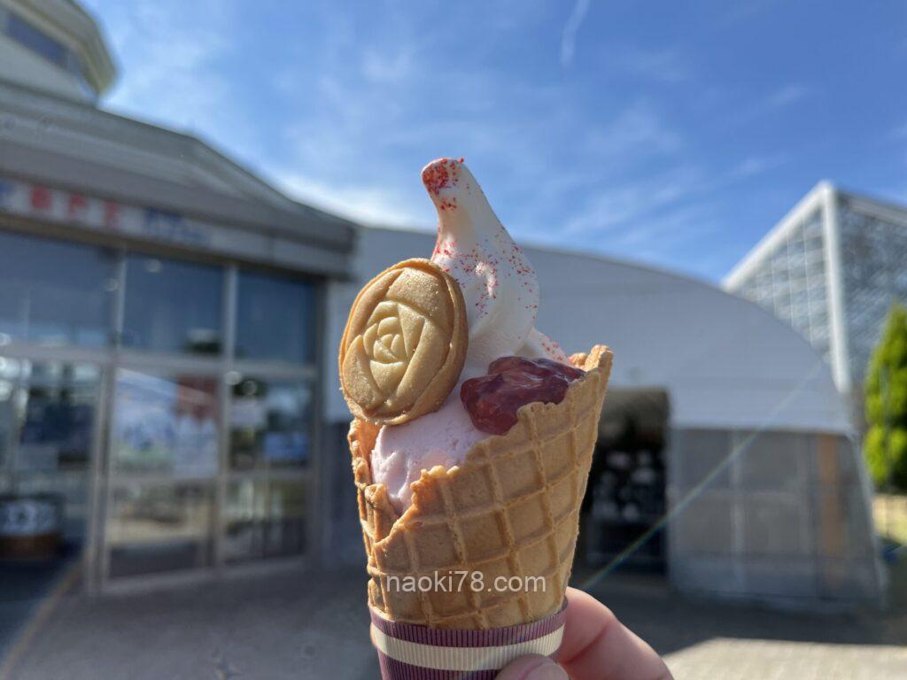 こちらの道の駅には鑑賞温室があるようで、その影響か、バラのエキス?を使った「ブーケソフト」と珍しいソフトクリームがあったので購入。
