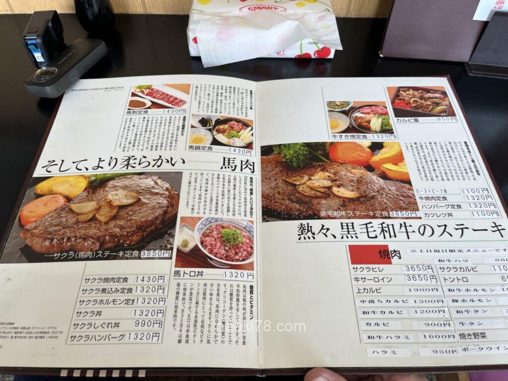 「桜肉(馬肉)」のメニューが多くある食事処。