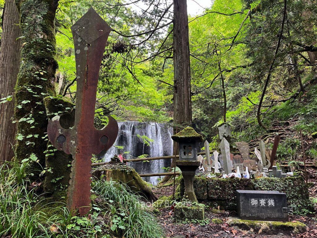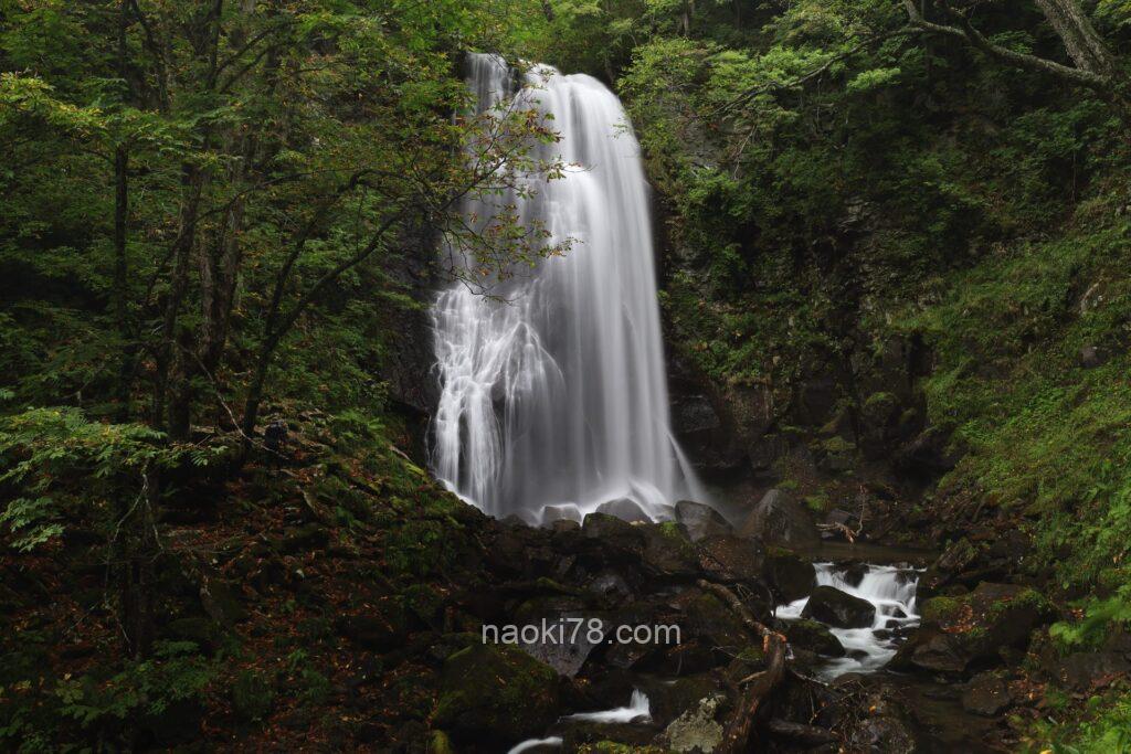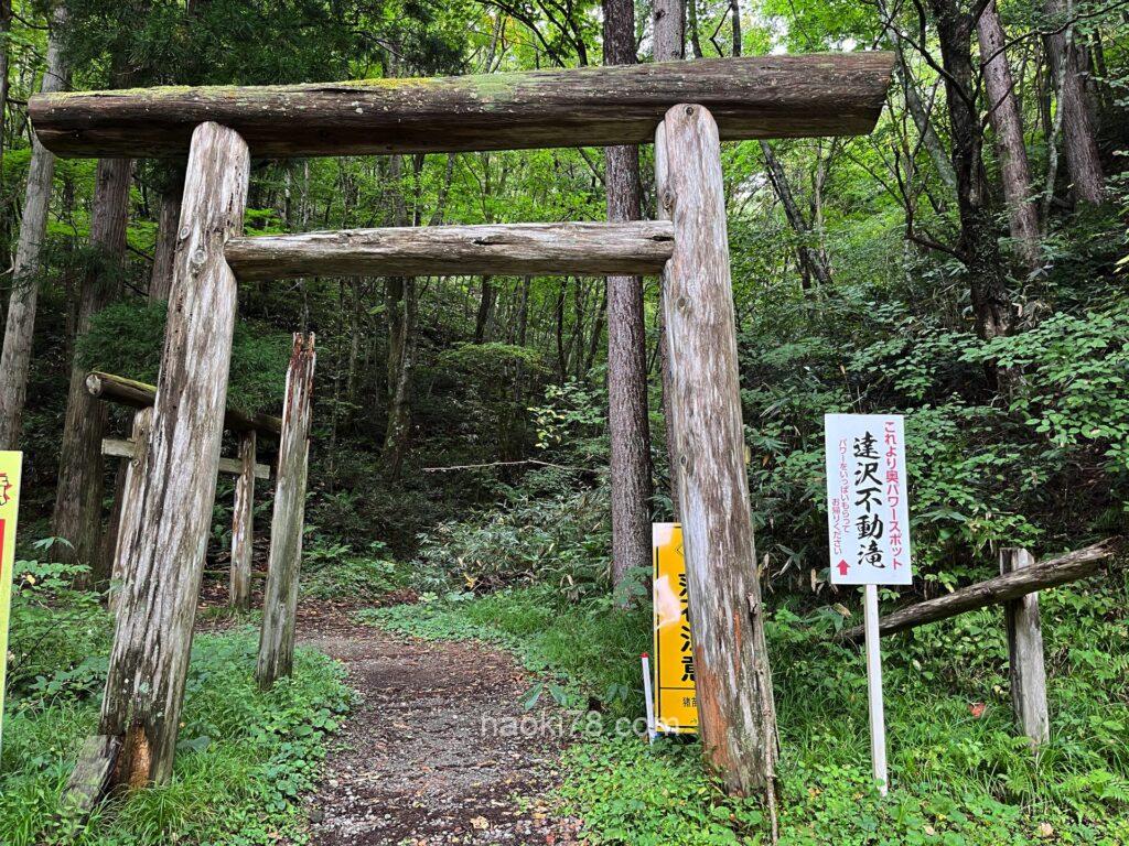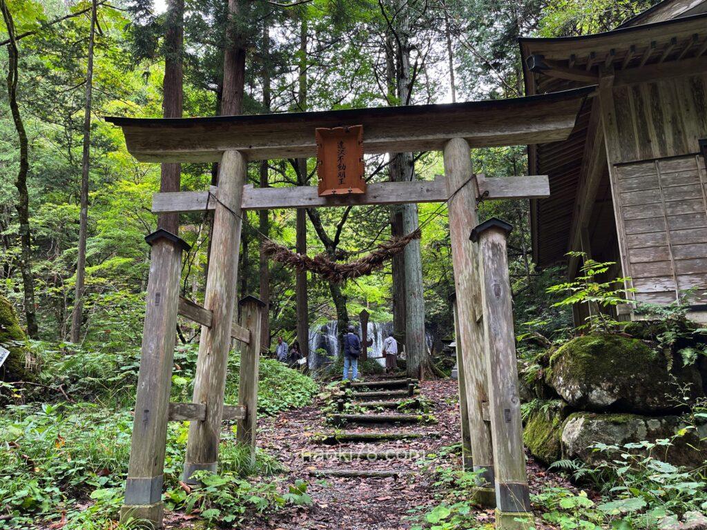 入り口の鳥居をくぐり、駐車場から10分ほど沢沿いを歩いて進むとまた鳥居があり、その奥に横幅の立派な滝。