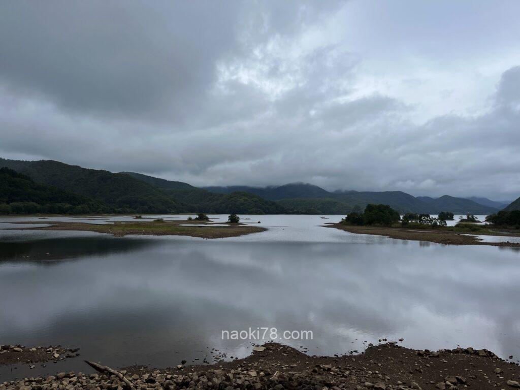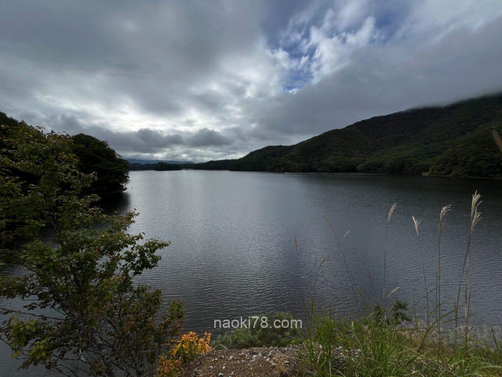 こちらの東岸の道沿いにある駐車スペースから小野川湖を眺められるポイントのようです。