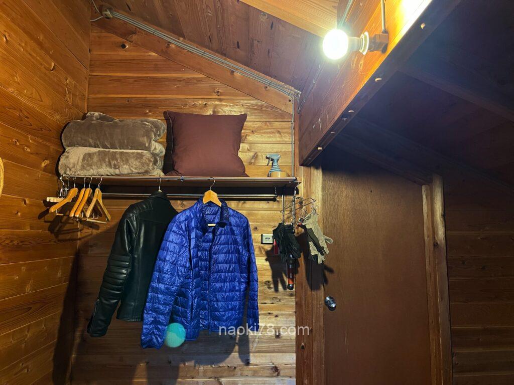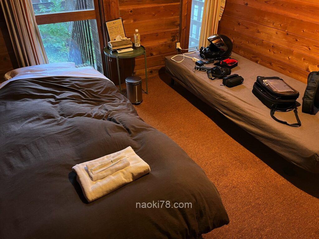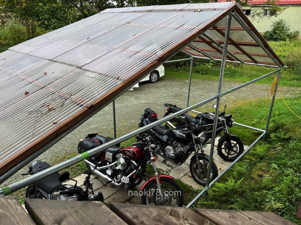 山小屋風の建物で、バイク用に屋根付き駐車場もあるお宿。
