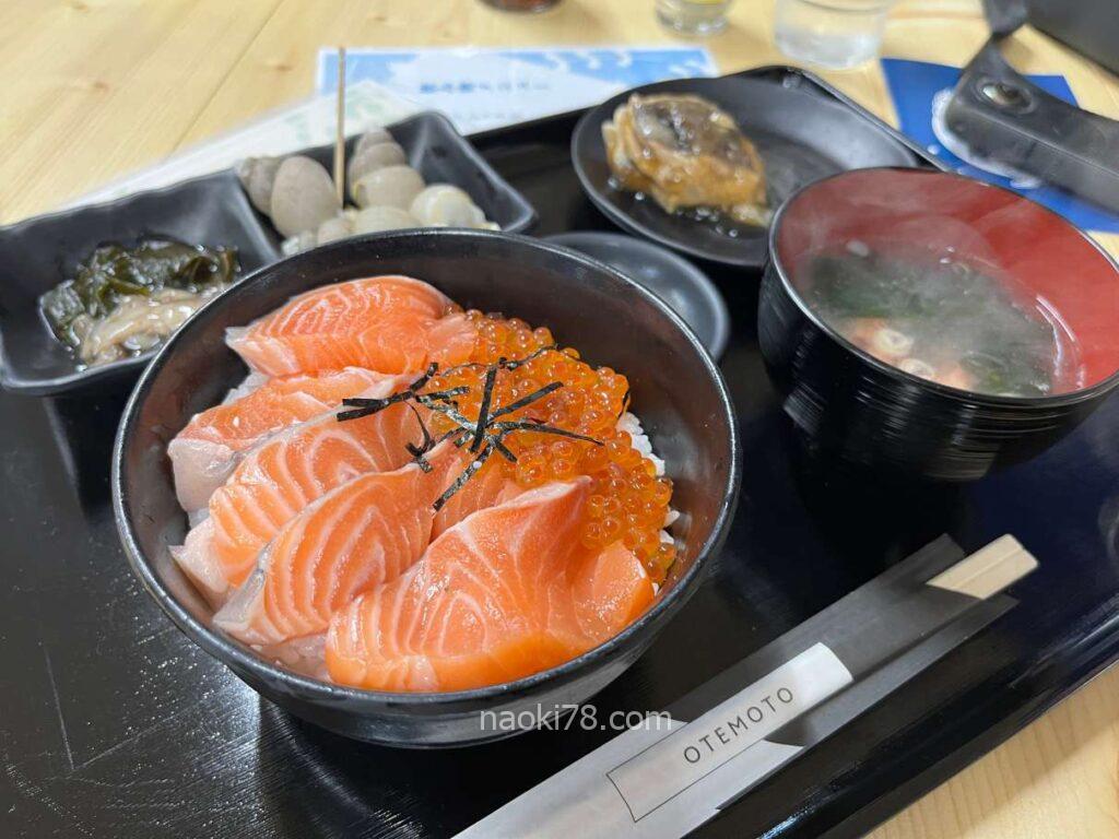 サケ親子丼を頼みましたが、こちらでもどんぶり以外に小鉢や魚もついてお得感あるメニューとなっていました。