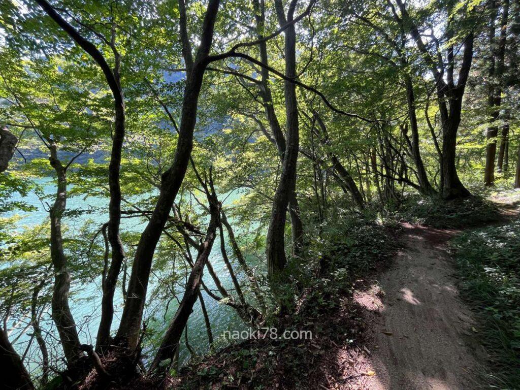 道の駅田沢から少し進んだところから県道4号線、県道8号線、菅沼峠を走り水没林で有名な白川湖へ。